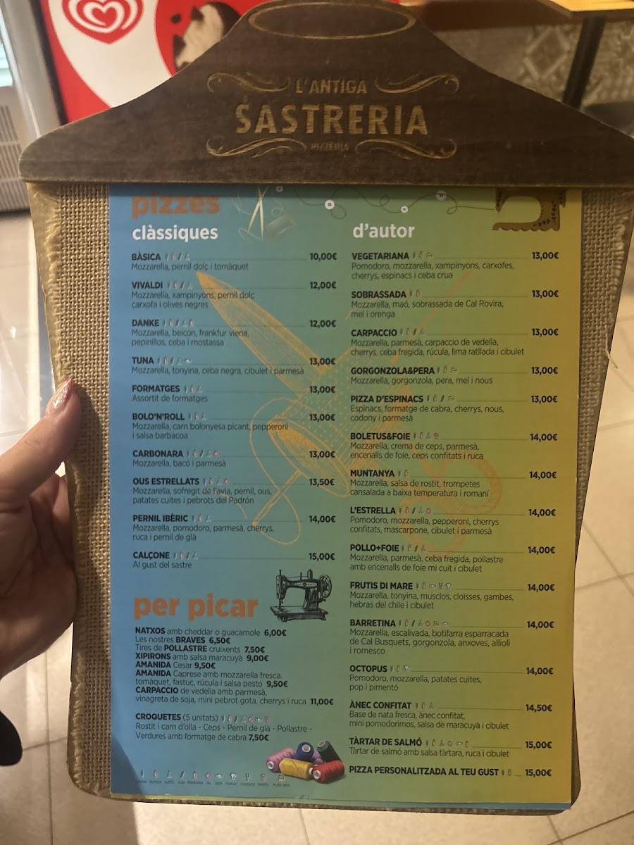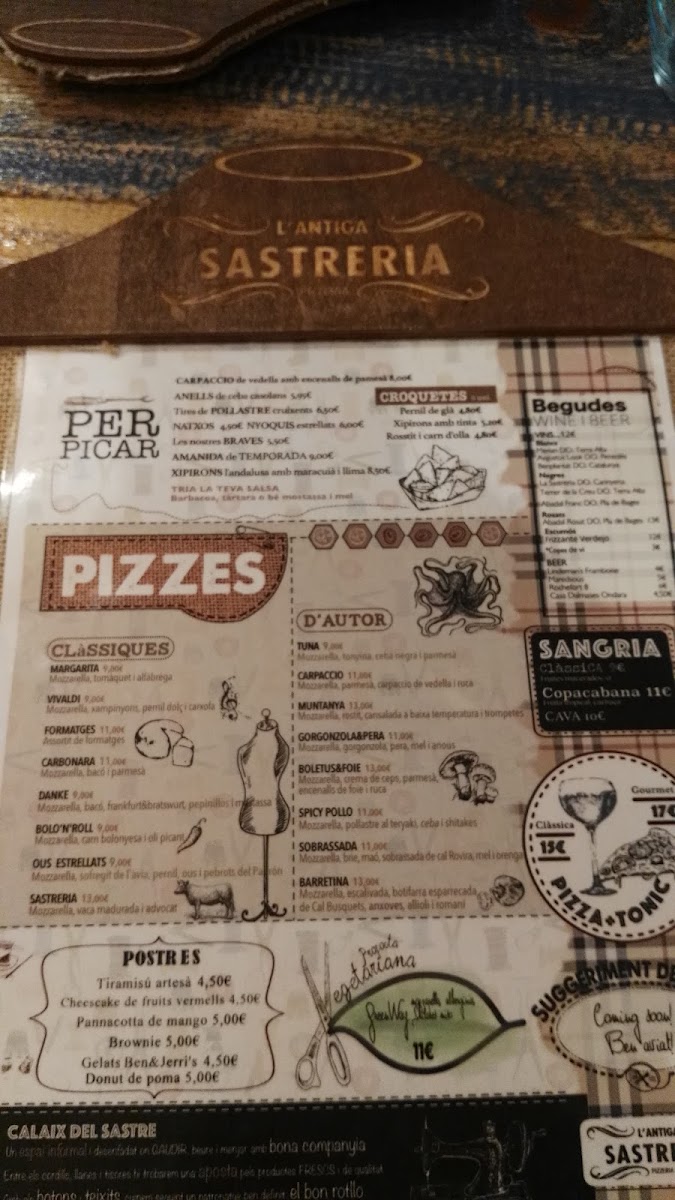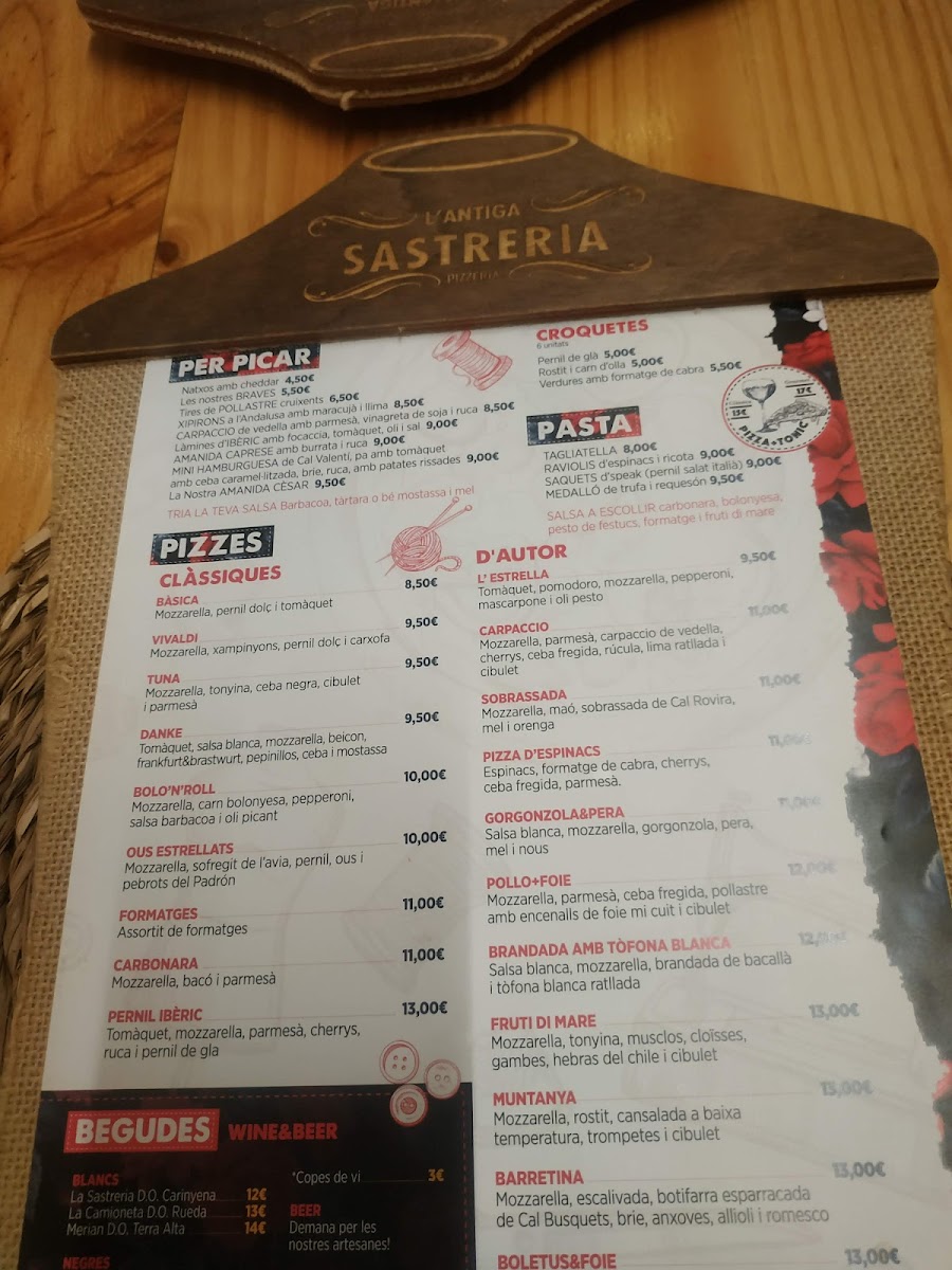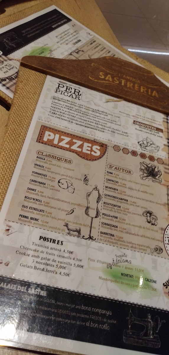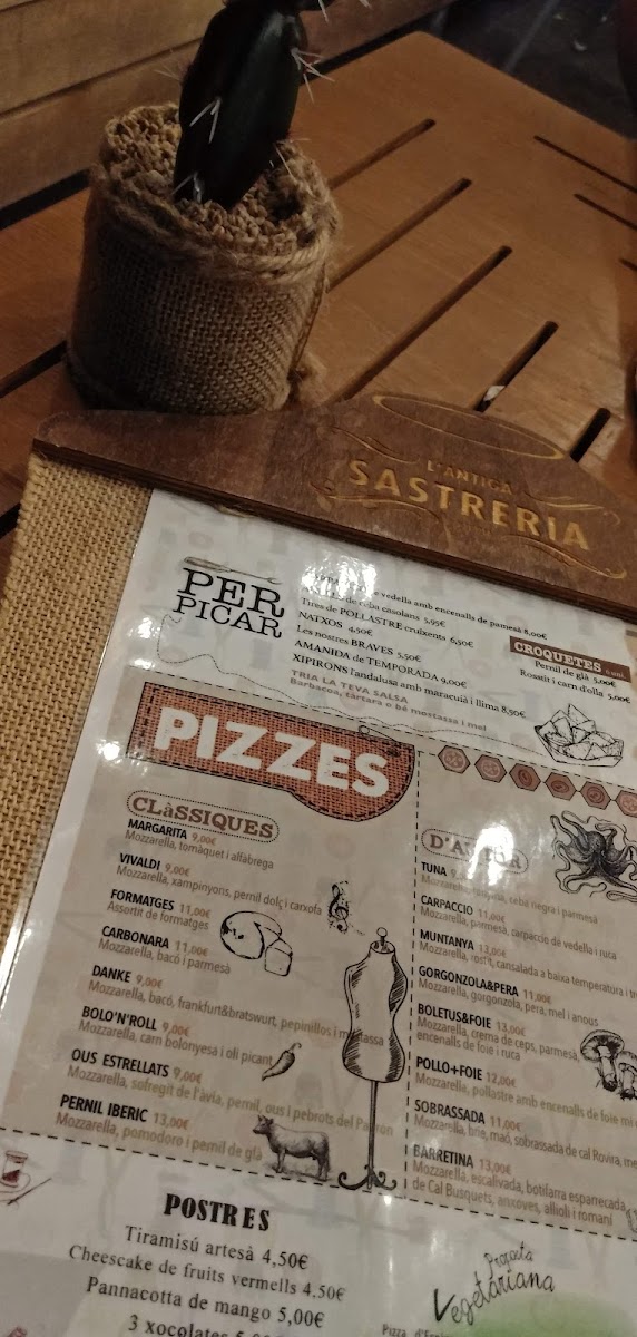 L'antiga Sastreria in Navàs offers a delightful and diverse menu that effortlessly blends traditional flavors with creative twists. A must-try is the Patates Braves, a classic Spanish tapa with a perfect balance of crispy, golden potatoes and a spicy, tangy sauce that leaves a lasting impression. For pizza lovers, the Pizza de Gorgonzola I Pera is an exceptional choice, with the bold, creamy gorgonzola paired beautifully with the sweetness of ripe pears, creating a harmonious contrast of flavors. Another standout on the menu is the Pizza Xuxes, which is both a feast for the eyes and the palate, offering a delicious combination of toppings that make each bite a new experience. The variety of dishes, from comforting tapas to innovative pizzas, ensures that there’s something for everyone at L'antiga Sastreria. The menu strikes a perfect balance between tradition and innovation, offering both familiar favorites and adventurous new options. Whether you’re visiting for a casual meal or a more indulgent experience, L'antiga Sastreria delivers on both taste and quality.